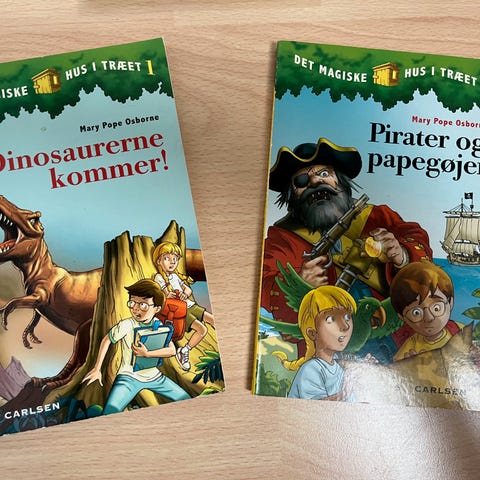 Mary Pope Osborne Det Magiske Hus i Træet bogsæt med 6 bøger på dansk. Sættet indeholder titlerne: "Dinosaurerne kommer!", "Pirater og papegøjer", "Mystiske mumier", "Midnat på Månen", "En farlig ridder" og "På flugt i regnskoven".