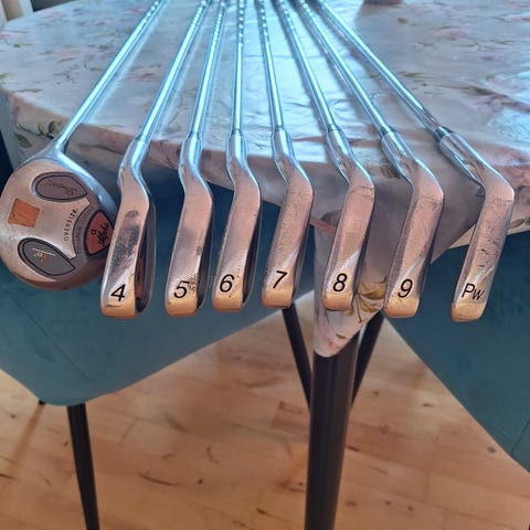 Super fint callaway begynder sæt som passer godt til nybegyndere. 7 jernet er udskiftet til en nyere model. Slagflader er i god stand, der er taget close up billede af det mest slidte jern.