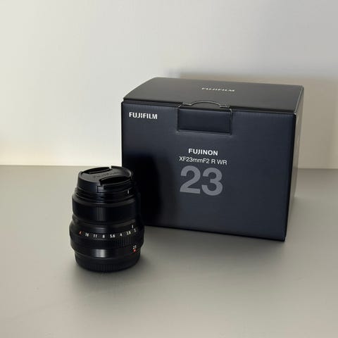 Fujifilm Fujinon XF 23mm f/2 R WR objektiv i sort.