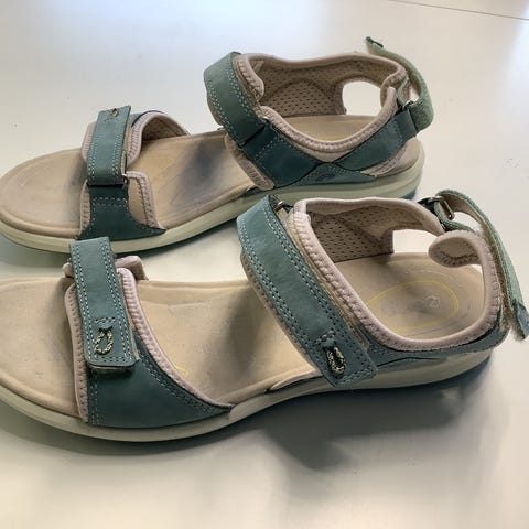 Ecco sandaler i størrelse 38. Modellen er en åben sandal med rem over forfoden og justerbar hælrem. Farven er sort. Sandalerne har en let forhøjet sål.
