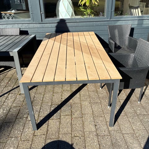 Rektangulært havebord i sort. Bordet måler ca. 225 cm i længden, 103 cm i bredden og 67,5 cm i højden. Velegnet som spisebord udendørs på terrasse eller altan. Bordpladen har lamel-look i kunsttræ og konstruktionen er med fire ben placeret i hjørnerne for stabilitet.