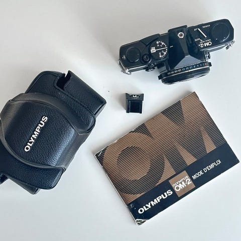 Nyrenoveret Olympus OM-2 MD med originalt garantibevis fra 1977.