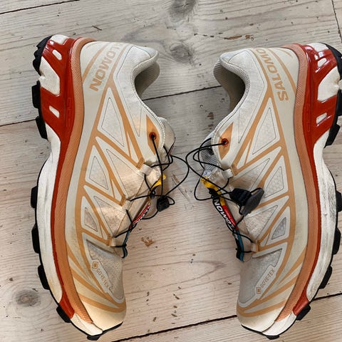Salomon S-Lab XT-6 sneakers i størrelse 46. Modellen er en trail-inspireret løbe- og fritidssko med snørelukning via Salomons Quicklace-system. Overdelen er i åndbart tekstil med syntetiske forstærkninger. Farven er overvejende brun med grå og sorte detaljer. Skoene har polstret hælkappe og tunge for komfort samt profileret ydersål, der giver godt greb på underlaget. Velegnet til både hverdagsbrug og let løb eller gåture.