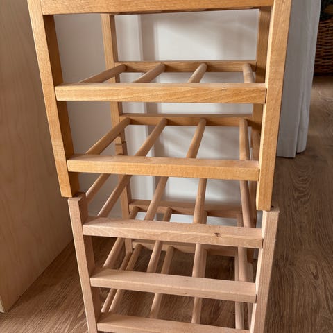 Vinreolen kan holde 9 vine og hylden deler et Kallax rum i to.