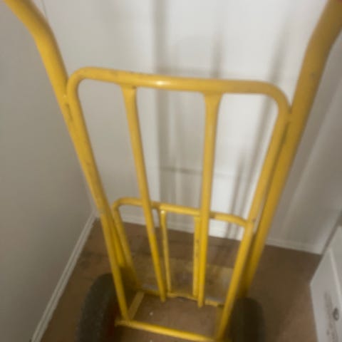 Sækkevogn i metal med to røde hjul. Egnet til transport af kasser, flyttekasser og andre tunge genstande.