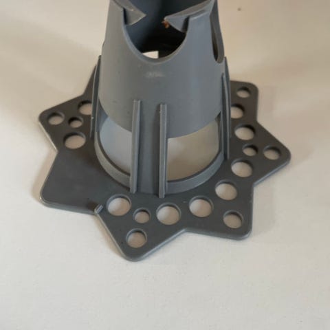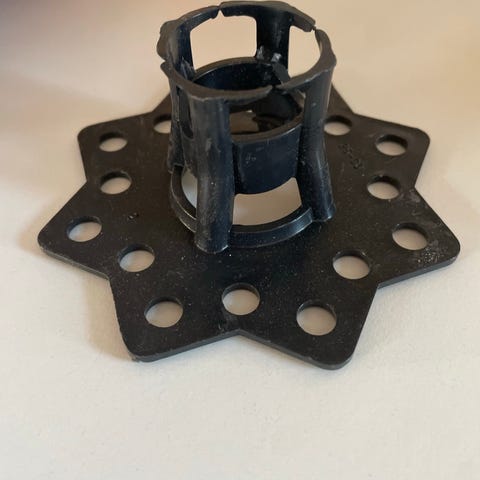 Plastbeslag med stjerneformet bundplade og gennemgående rørformet holder, bruges til at holde rionet m.v. I forbindelse med betonstøbning. Højde 6,3 cm højde, for rionet m.v. 3.5 el. 4cm fra bund pris 2 dkk. Pr. Stk, har mange så hvis du køber alle får du rabat har mindst en sæk fuld. se mine andre annoncer for andre størrelser