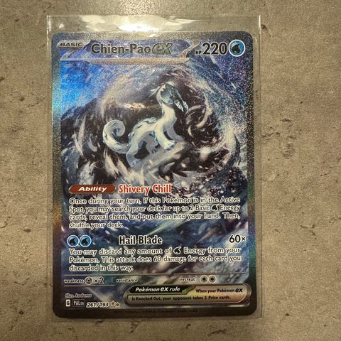 Pokémon Chien-Pao ex samlekort med holo-effekt. Kortet viser Chien-Pao ex med angreb og spilinformation på forsiden og standard Pokémon-bagside. Egnet til samling og brug i Pokémon Trading Card Game.