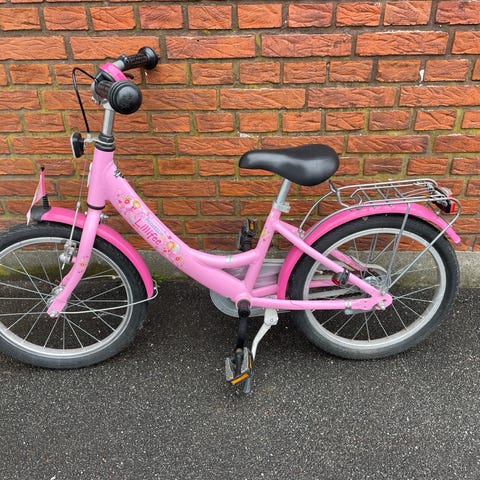 Everton børnecykel med 18" hjul i pink farve. Cyklen har kurv foran og bagagebærer bagpå. Udstyret med støtteben og fulde skærme. Egnet til børn, der passer en cykel med 18" hjulstørrelse.