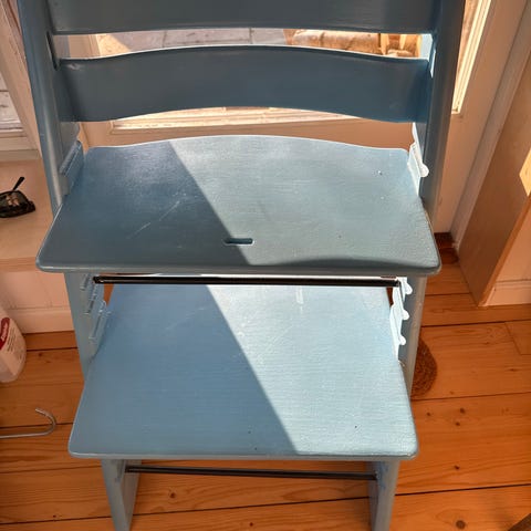 Klassisk justerbar højstol med sæde- og fodplade, der kan flyttes i højden efter barnets størrelse.