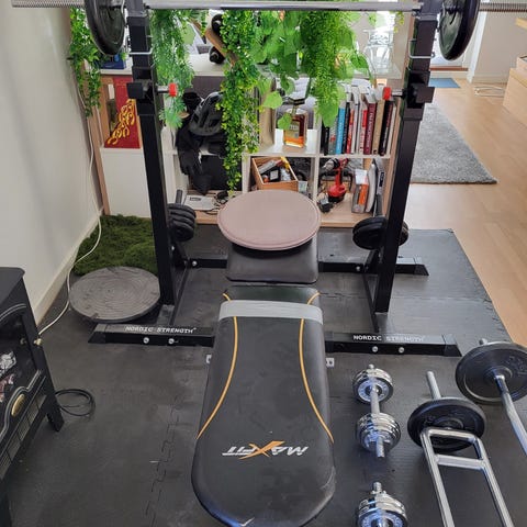 Har du behov for mere vægt sælger jeg et andet næsten identisk sæt med samme stænger og vægte, men en anden bænk hvor holdere og træningsbænk er i ét stykke og bænken kan rejses/klappes op ved opbevaring, til samme pris som dette. Køber du begge sæt er prisen 1800,- samlet. Du kan se det andet sæt i listen over andre annoncer fra mig nedenfor.