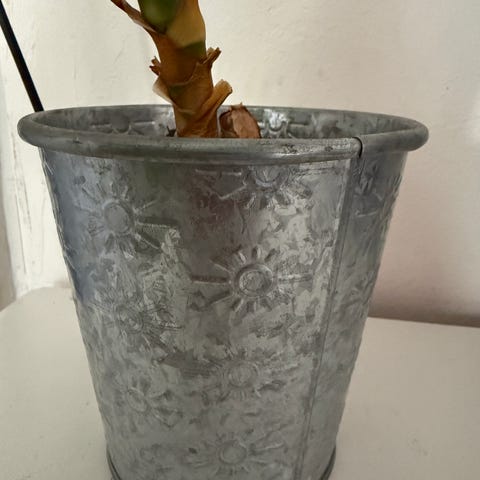 Grøn stueplante i lyserød urtepotte med underskål. Planten har aflange, grønne blade og står i jord i en rund potte med let ru overflade. Egnet som indendørs pynteplante i fx køkken, stue eller kontor. Kræver almindelig pasning af stueplanter med vanding efter behov og lys efter plantens art.