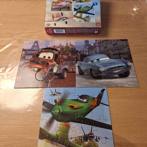Disney Pixar Cars puslespil med 2 motiver fra filmen Cars. Sættet indeholder 2 puslespil med hver 24 brikker. Motiverne viser blandt andet Lynet McQueen og andre biler fra universet. Velegnet som aktivitet for børn, der kan lide Cars og puslespil.