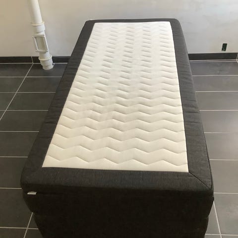 Jysk Dreamzone Fjelna M + Ekso boxmadras med gelfoam topmadras. Sengen består af en polstret boxmadras med mørkt tekstilbetræk og tilhørende ben samt en hvid, quiltet gelfoam topmadras fra Dreamzone. Topmadrassen har aftageligt betræk med lynlås. Velegnet som enkeltseng i soveværelse, gæsteværelse eller ungdomsværelse.