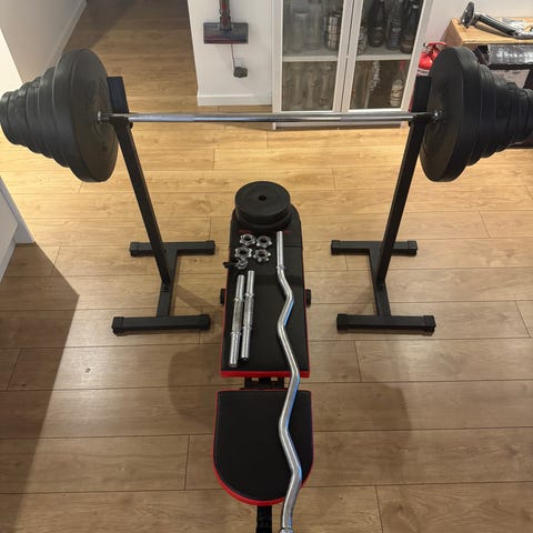 Har du brug for mere vægt sælger jeg også et andet næsten identisk sæt med samme stænger og vægtskiver, men en anden bænk. Begge sæt kan købes samlet for 1.800,-