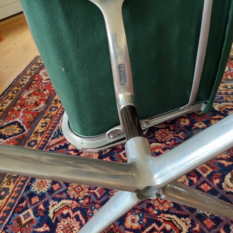 Flot og eftertragtet Eames 208 Soft Pad stol i en ældre udgave. Den mangler mærkat, hvilket er typisk for de tidligere modeller. Der er tale om en amerikansk version, kendetegnet ved brugen af unbrakoskruer – en detalje, der understreger stolens autenticitet og oprindelse.