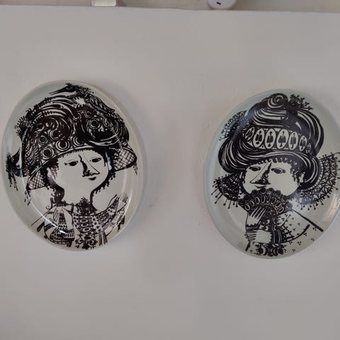 Bjørn Wiinblad Optimisme vægplakette i porcelæn. Rund platte i hvid med rød dekoration, motiv med figurer og blomster på forsiden og tekst på bagsiden. Plaketten har hul til ophæng og kan anvendes som vægdekoration eller samlerobjekt.