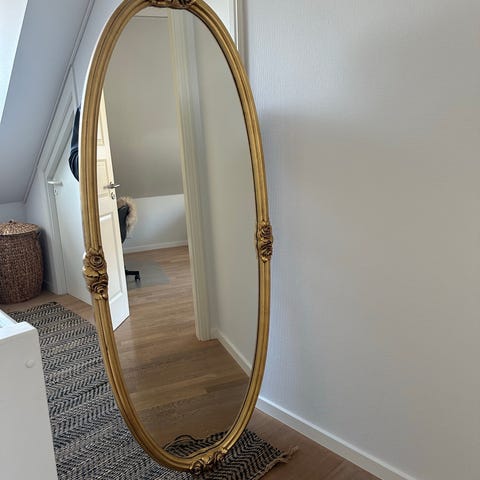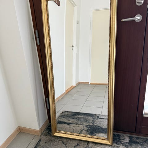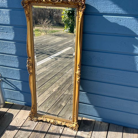 Rektangulært spejl med dekorativ guldfarvet ramme. Spejlet har profileret kant med klassiske ornamenter. Egnet til ophæng i stue, entre, soveværelse eller gang som vægspejl og dekoration.