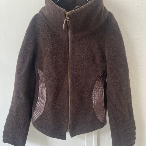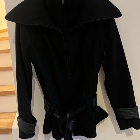 MINUS kort sort et lags 80% uld jakke. Bindebånd. Enkel. God som overgangs jakke/ trøje. Høj krave.