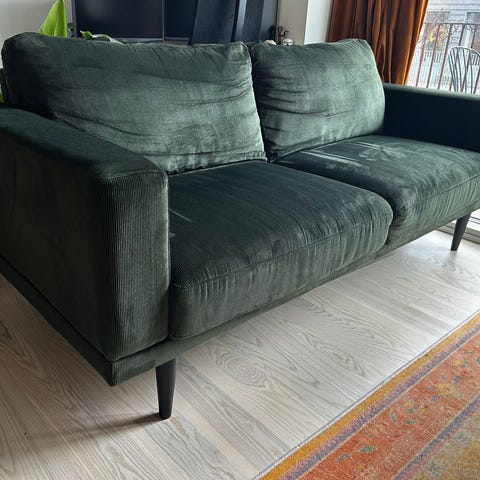 Brugsspor men god som ny. Har en lille plet på den ene pude fra maling, da vi malede lejligheden. Kan nok godt komme af - vi har bare ikke gjort noget ved det.