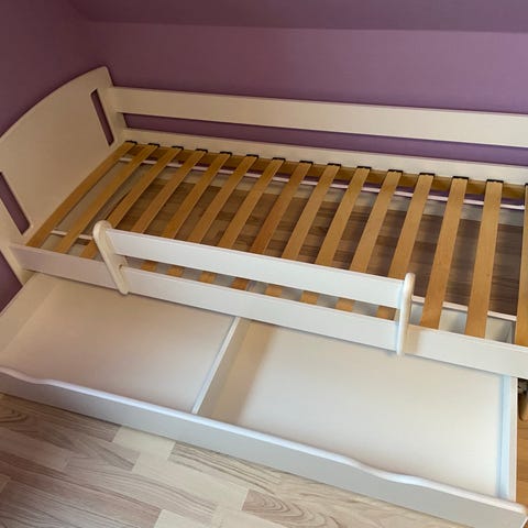 Juniorseng i husform med sengehest og to opbevaringsskuffer under sengen. Sengen er i hvid farve og egnet til mindre børn, der er vokset ud af tremmeseng. Husrammen kan bruges til ophæng af let pynt eller lys. De to skuffer under sengen giver ekstra plads til opbevaring af f.eks. sengetøj eller legetøj. Sengen er velegnet til børneværelset som overgangsseng mellem tremmeseng og almindelig seng.