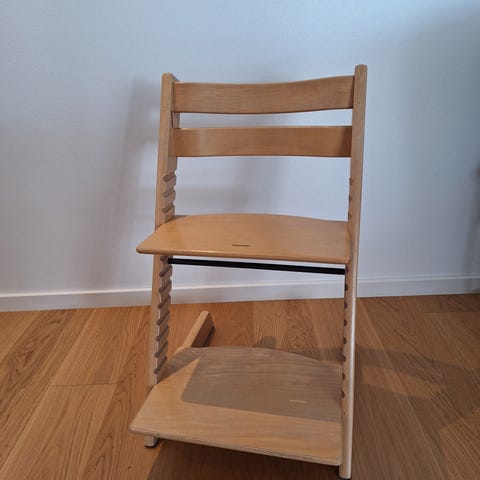 Stokke børnestol i træ. Klassisk højstol med justerbar siddeplade og fodplade, som kan tilpasses barnets højde. Stolen har tværstænger i metal og er egnet til brug ved spisebord eller som siddeplads til børn i forskellige aldre. Velegnet som praktisk siddemøbel i køkken eller spisestue.