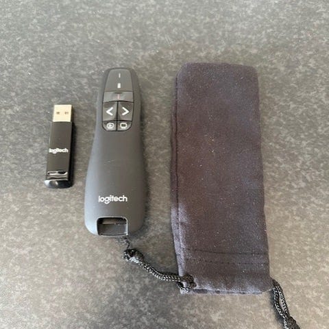 Logitech R400 Wireless Presenter sælges brugt, men fungerer fint.