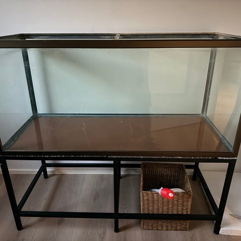 Lille fint akvarium med pumpe, lysarmatur, bord og lidt tilbehør som ses på billedet.