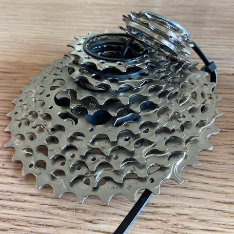 Cykelkassette i sølvfarvet metal. Kassette med flere tandhjul til montering på baghjul til cykel. Velegnet som reservedel eller udskiftning af eksisterende kassette på cykel med kompatibelt kassettehus og gearsystem.