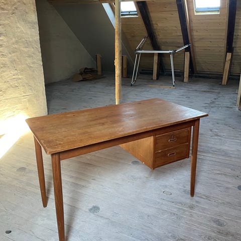 Et gammelt bord fra en folkeskole på Nørrebro, nænsomt restaureret.