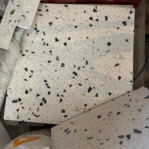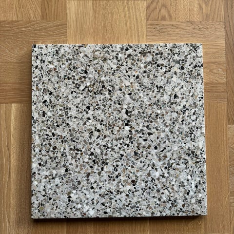Italienske keramiske fliser i Terrezzo-look fra Moisaikhjørnet. Egnet til vådrum. Sælges samlet.