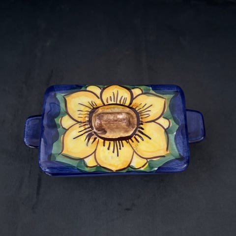 Farverig håndmalet smørskål med middelhavsstemning. Perfekt til brunchbordet eller sommerhuset. Et lille stykke køkkenglæde der får selv rugbrødet til at smile.