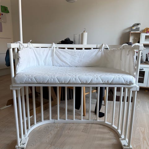 Babybay bedside crib i hvidt træ. Sengen er udformet som en åben side-seng, der kan stå tæt op ad forældresengen. Højden på liggefladen kan justeres, så den passer til forskellige sengehøjder. Egnet til spædbørn fra nyfødt og op til ca. 9 måneder, afhængigt af barnets vægt og bevægelighed. Madrassen følger formen på sengen og medfølger efter aftale med sælger. Velegnet som samsovningsløsning, hvor barnet ligger tæt på forældrene, men i egen seng.