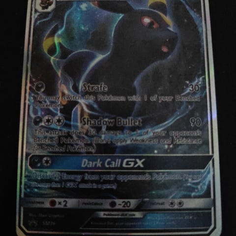Pokémon Umbreon GX samlekort. Kortet viser Pokémonen Umbreon i GX-version med angrebene Strafe, Shadow Bullet og Dark Call GX. Standard Pokémon TCG-kortstørrelse med illustreret forside og klassisk Pokémon-bagside. Egnet til samling eller brug i Pokémon Trading Card Game-kampe.