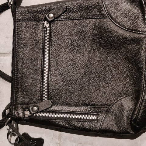 Skuldertaske i ægte læder til unisex. Tasken er sort og har justerbar skulderrem. Designet er enkelt med syninger på midten af taskens for- og bagside. Velegnet som hverdagstaske til opbevaring af mindre personlige ejendele som pung, telefon og nøgler. Fremstillet i glat og let struktureret læder, som fremgår af mærket med teksten “ægte læder”. Også velegnet på ferie.