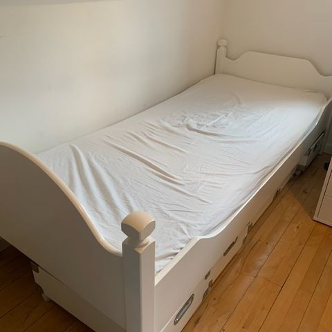 Sælges uden madrasser, som vi købte i Jysk. Sengen skal skilles ad for at komme ud af værelset.
