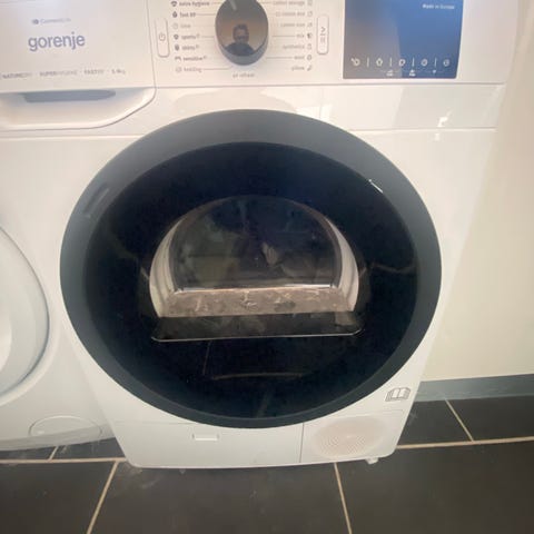 kondenstørretumbler i hvid. Frontbetjent model med rund glaslåge og elektronisk betjeningspanel med drejeknap og display. Tørretumbleren er en kondensmodel, hvilket betyder, at fugten samles i en beholder i stedet for at blive ledt ud gennem en aftræksslange. Tromlen er i rustfrit stål med struktur for skånsom tørring af tøjet. Velegnet til almindelig husholdningsbrug med forskellige programmer og funktioner, der kan aflæses og vælges på frontpanelet.