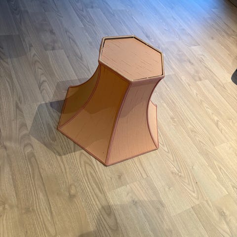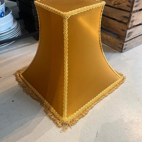 Lampeskærm, Kæmpe håndlavet retro lampeskærm beklæde med naturmaterialer på både stel og selve skærmen. Skærmen er i en smuk patineret farve.