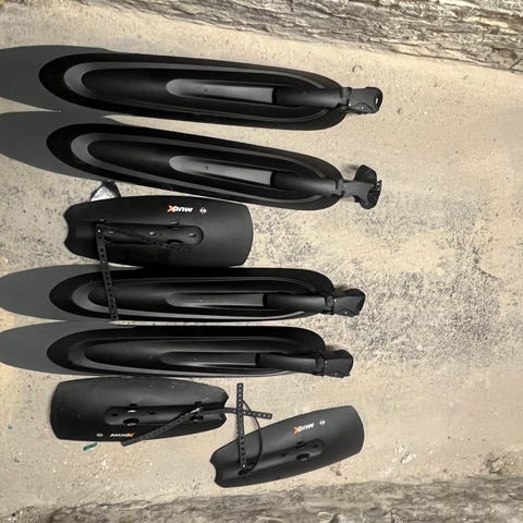 SKS X-Blade skærmsæt til cykel i sort plastik. Sættet består af en bred bagskærm med beslag og stivere samt en mindre forskærm. Skærmene er velegnede til montering på cykler, hvor der ønskes ekstra beskyttelse mod vand og snavs. Beslag og metalstivere til fastgørelse medfølger som vist på billederne.
