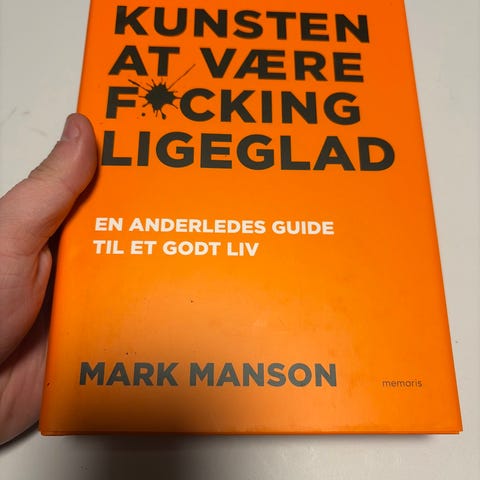 Mark Manson Kunsten at være f*cking ligeglad bog på dansk. Paperback/softcover med orange omslag. Undertitel: "En anderledes guide til et godt liv". Genren er selvudvikling/personlig udvikling. Velegnet til læsere, der er interesserede i livsstil, psykologi og personlig udvikling på dansk.
