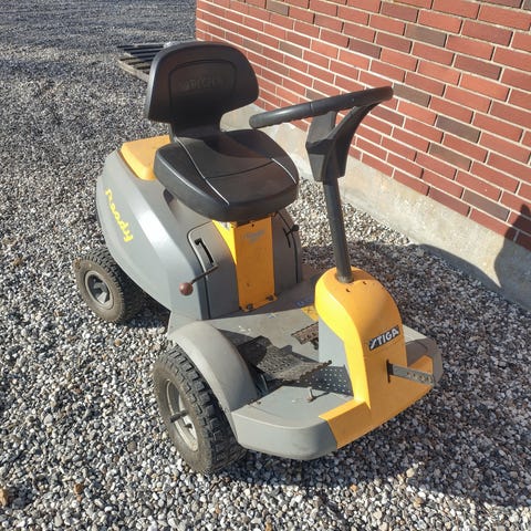 Plænetraktor med monteret frontskovl. Traktoren har sæde, fire hjul og betjeningshåndtag til løft og sænkning af skovlen foran. (Sneskraber) mm
