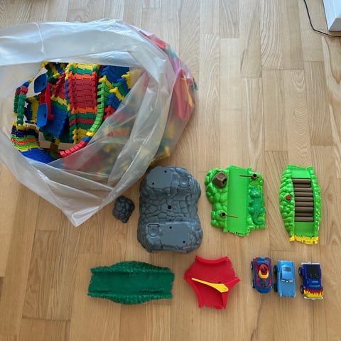Flexi Trax legetøjsbiler. Er i tvivl om, om de kan køre, men tror det. Sættet består af tre forskellige biler, herunder en blå bil med Spiderman-motiv på toppen samt to andre biler i forskellige farver og design. Egnet som legetøj til børn eller som samlerobjekter for fans af superhelte og bilfigurer. Samlet 100 kr.