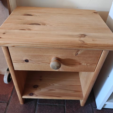 Natbord i hvidt trælook med én skuffe og åben hylde nederst. Skuffen har greb på fronten og giver opbevaringsplads til mindre ting. Den åbne hylde kan bruges til bøger eller andre genstande. Velegnet som sengebord eller lille sidebord i soveværelse eller stue.