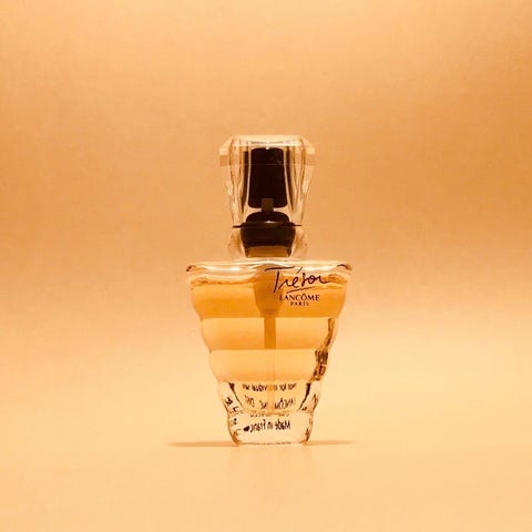 Lancôme Trésor Eau de Parfum er kendt for sin ikoniske, facetterede glasflakon, der er formet som en omvendt pyramide og den ravfarvede parfume indeni.