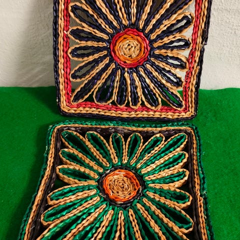 2 stk. retro bordskånere, udført i flettet, flerfarvet naturmateriale.