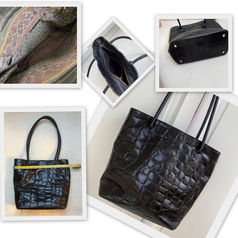 Mulberry håndtaske i læder med guldfarvede metalbeslag, der dog har mistet lidt farve, se foto. Tasken har to håndtag og en lynlås for sikker lukning. Forsiden har Mulberrys ikoniske logo prydet på metalplade. Indvendig er der et rummeligt åbent rum samt mindre lynlåsrum på bagsiden for ekstra opbevaring.