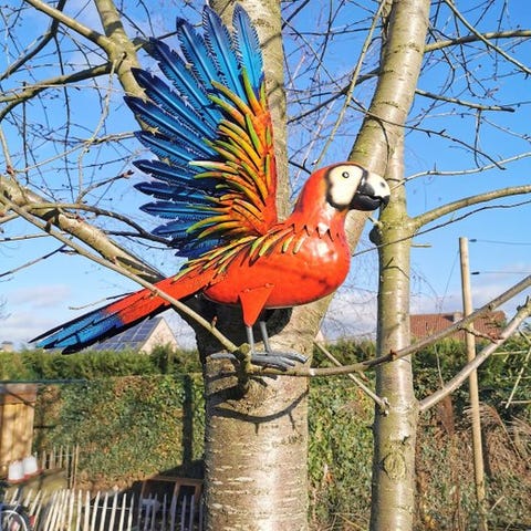 Det drejer sig om en smuk skulptur til haven eller til indendørs brug. En super smuk og stor papegøje lavet af smedet metal. Flotte farver! Med følgende mål: