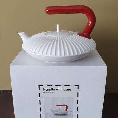 Inden for New Originals-projektet tog Hutten en klassisk kinesisk tekande og gav den et dristigt, moderne twist. Den oprindelige var støbejern, men Hutten byttede den ud med glat porcelæn, hvilket gjorde den lettere og mere frisk. I stedet for den sædvanlige fine kurve på håndtaget lånte Richard Hutten grebet fra en rigtig gammeldags strygejern. Strålende rød og nem at holde, er den designet til at beskytte dine hænder, når du hælder varm te op i din kop.