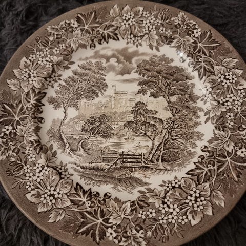 Smukt sæt af seks engelske jernstenplader produceret af British Anchor Pottery Co. Ltd., Staffordshire, England, i den klassiske Olde Country Castles-mønstret.