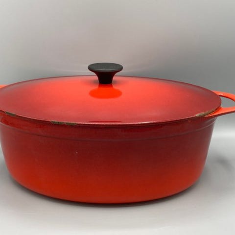 Smuk lille gryde af støbejern emaljeret i dyb orange nuance, rund og ideel til store borddækninger, familie- eller professionelt køkken.