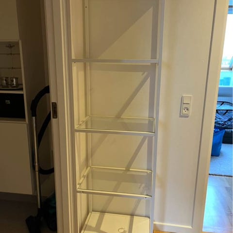 Vittsjö reol fra ikea. Den står pæn, den er sort med 3 glasplader og en sortbrun træplade nederst.